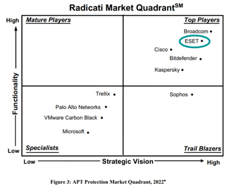 A ESET foi reconhecida como ‘Top Player’ no relatório Advanced Persistent Threat (APT) Protection Market Quadrant 2022 da Radicati pelo terceiro ano consecutivo.